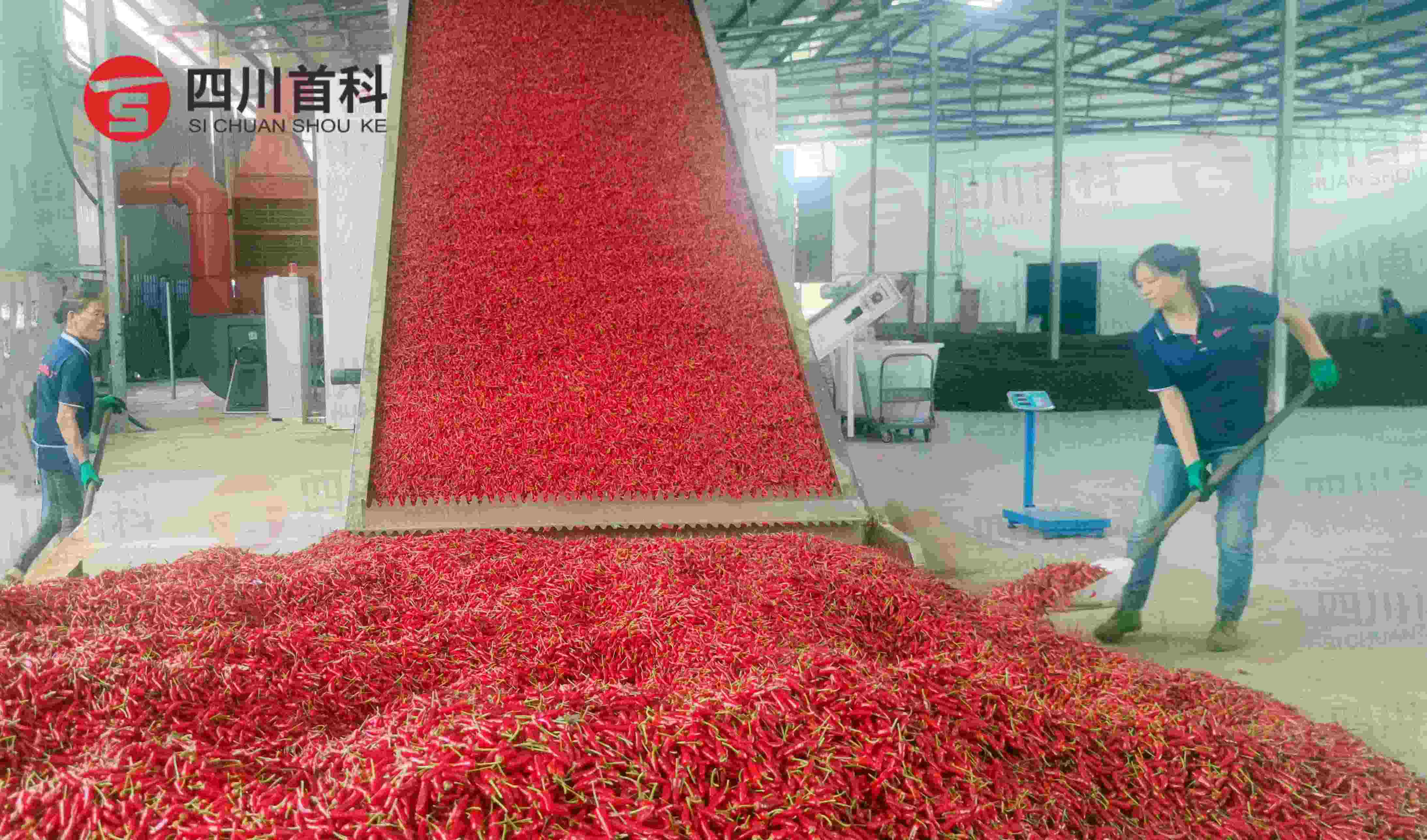 南充首創(chuàng)科技為該辣椒合作社先后提供兩條辣椒烘干生產(chǎn)線,烘干輸送速度、溫度、濕度均由電腦控制,可24小時烘鮮椒。通過對比圖看到,紅彤彤的新鮮辣椒經(jīng)過首創(chuàng)辣椒烘干機烘干后,色澤油亮,紅潤光滑,無污染、保留了辣椒味美色鮮。分揀車間內(nèi),色選機、去把機、篩選機高速運轉(zhuǎn),工人們熟練的將辣椒倒入加工機器中完成分揀、打包、裝袋等工序,生產(chǎn)現(xiàn)場繁忙而有序。