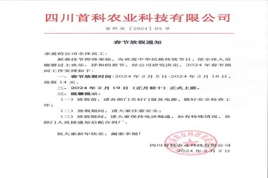 四川首科2024年春節(jié)放假通知!!親愛的公司全體員工: 新春佳節(jié)即將來臨,為歡度中華民族傳統(tǒng)節(jié)日,使全體人員能夠...